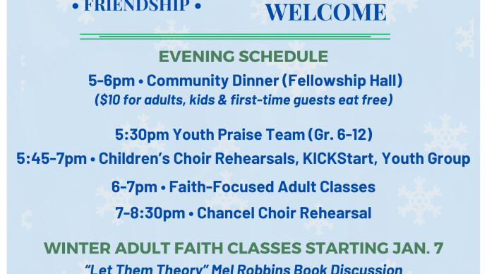 All are invited for our weekly Wednesday night chef-prepared community meal, youth choirs, youth group, children's programming, adult faith-classes and Chancel Choir.