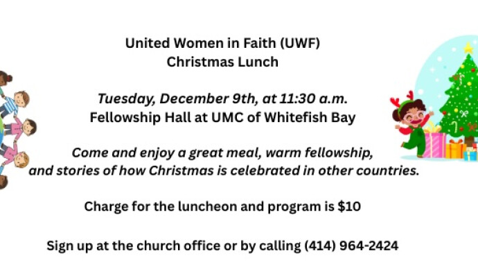 United Women in Faith (UWF) Christmas Lunch Christmas Traditions Around the World Tuesday, December 9th, at 11:30 a.m. Fellowship Hall at UMC of Whitefish Bay Come...